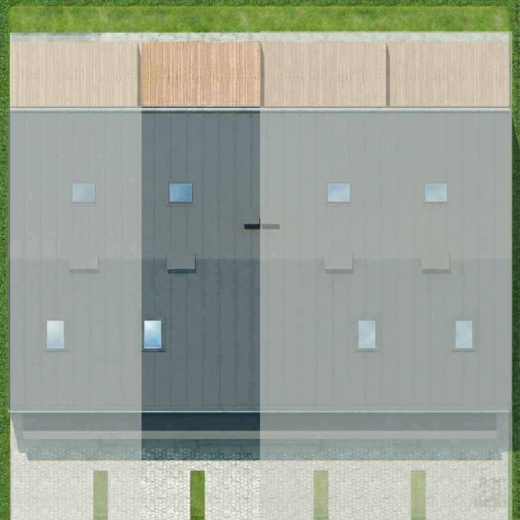 Projekt charakteryzuje się nowoczesną, minimalistyczną bryłą z bezokapowym dachem. Elewacja została wykończona jasnym tynkiem urozmaiconym okładziną z cegły oraz strukturą betonu, co nadaje budynkowi prestiżowy wygląd.